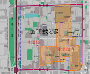 北院门历史文化街区是西安市历史文化名城的重要组成部分,是西安市明清长安城内三大历史文化街区中面积最大、历史文化遗存最为丰富的历史文化街区,其核心保护区范围东至社会路,西至洒金桥,南临西大街,北至莲湖路,面积约73.4公顷;其建设控制区东至北大街,西至西安城墙,南至西大街,北到莲湖路,面积约224公顷。该历史文化街区内有钟楼、鼓楼、化觉巷清真寺和都城隍庙等国家级保护文物单位6处,省级文保单位6处,市级文保单位2处。保持着较为完整的明清街巷院落格局与肌理,是西安历史街区的典型代表。