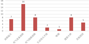 分析北院门历史文化街区2016-2018年间发生的47起火灾。从火灾发生原因来看主要包括油锅起火、电气设备故障、电气线路故障、生活用火不慎、吸烟、遗留火种等,其中电气火灾起数占比为34%,其次为电气线路故障、遗留火种和油锅起火,分别占火灾起数17%,电气火灾和油锅起火是该区域的主要火灾原因。
