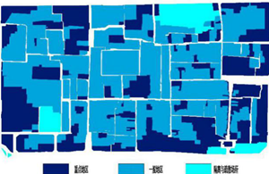 用地性质和功能方面,按照功能的重要性分为重点地区、一般地区和隔离疏散场所,火灾危险性打分分别为4分、2分和0分;人口密度参考相关规范和国内其他城市老城区人口密度情况,分为高、中、低等三个等级,高密度区位200人/公顷以上,打分为3分,中密度区为115-200人/公顷,打分为2分,低密度区为115人/公顷以下,打分为1分;建筑密度主要参考《陕西省城市规划管理技术规定》(陕建发【2017】473号),建筑密度低于30%为低密度区,打分为1分,建筑密度30%-60%为中密度区,打分为2分,建筑密度大于60%为高密度区,打分为3分;历史文化价值分为高、中、低三个等级,高价值区主要包括市级以上文保单位,打分为3分,中价值区为历史文化街区核心区的其他地区,打分为2分,低价值区为历史文化街区建设控制区的其他地区,打分为1分;人流热力图主要参考百度地图的热力图,分为高、中、低三个等级,打分分别为3分、2分和1分。赋值越高火灾危险性越大,反之风险性则越小。