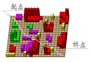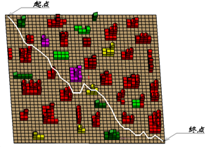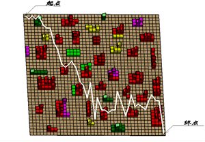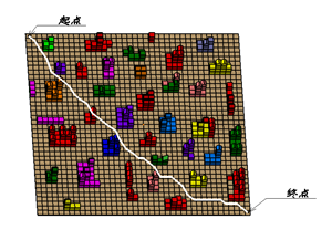 (xs,ys),(xf,yf)分别代表路径起始点与终点坐标。此设计将两个因素综合在一个函数中,实现了量化的统一。路径长度越小,与障碍相交次数越少,则适应度函数值越大。