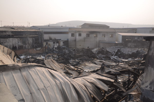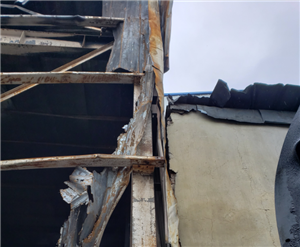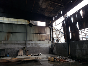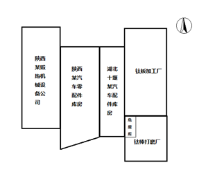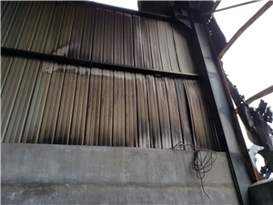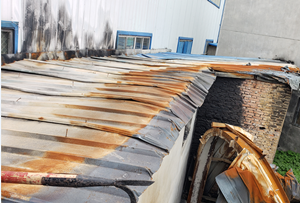 起火单位是陕西某汽车零配件销售公司,主要经营汽车配件,起火建筑为单层钢结构建筑,建筑面积2000平方米,南北长60米,东西长35米,从中间分隔后分为两个库房,其中靠东边的库房租赁给湖北十堰某汽车配件公司做库房,剩余部分自己使用,东北侧为某钛板加工厂,东南侧为某钛棒打磨厂,西侧为某锻热机械公司(见图1)。其中陕西某汽车零配件公司和湖北十堰某汽车配件公司两个库房全部过火(见图2)。钛板加工厂,单层钢结构,建筑面积1400平方米,主要经营钛板的切割,厂房西南角局部过火(见图3)。某钛棒打磨厂,单层钢结构建筑,建筑面积1000平方米,主要经营钛棒打磨,其单位西侧与湖北十堰某汽车配件库房紧挨的危废库房彩钢板顶部过火(见图4)。这4家企业之间仅使用单层铁皮分隔。位于汽车配件库房西侧的某锻热机械设备有限公司,单层彩钢板建筑,面积2800平方米,厂房东侧彩钢板局部过火。