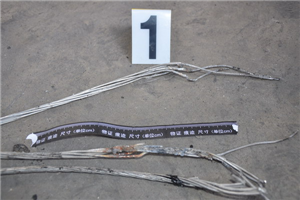 辖区消防救援机构在起火点下方1.8米处(钛板加工厂南侧墙壁上)提取到电气线路融痕(见图9)。送至天津消防研究所鉴定,经鉴定为短路熔痕。