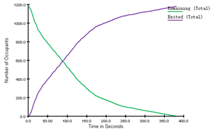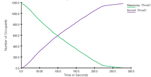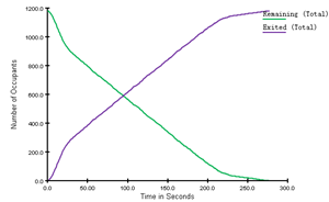 在SFPE模式下模拟中,疏散运动时间为276.53秒,时间与人数的分布可得到曲线分布图5