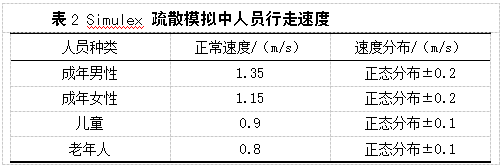 对于不同人员类型疏散时的行走速度我们参考同为疏散仿真软件Simulex的分布。速度分布使用正态分布,为了反应较大的离散程度,标准差采用软件自带的系数1。见表2。