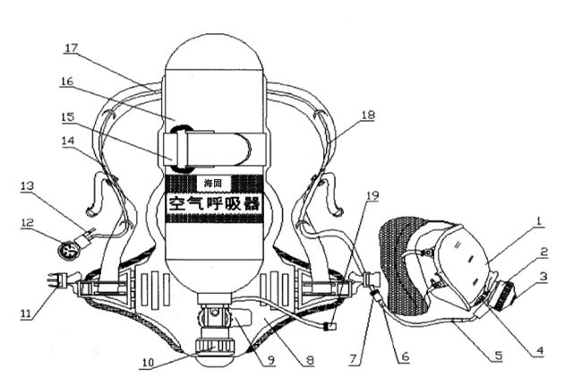 1正压式全面罩 2 正压式空气供给阀 3正压式空气供给阀供给开关4正压式面罩呼气阀 5中压导管供给阀插头组 6快速插头 7 快速插头锁紧帽 8背托组 9减压器 10 气瓶开关 11腰带 12 气源压力表 13 气瓶余压报警器14肩带 15 气瓶 16 气瓶固定带 17 高压导气管组 18 中压导气管减压器插头座组 19 他救接口