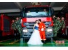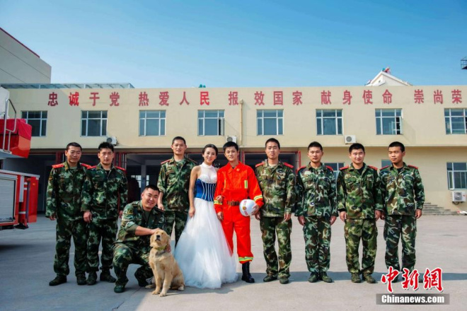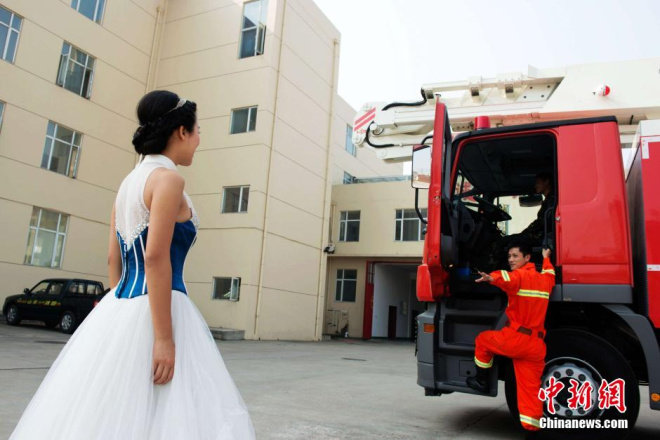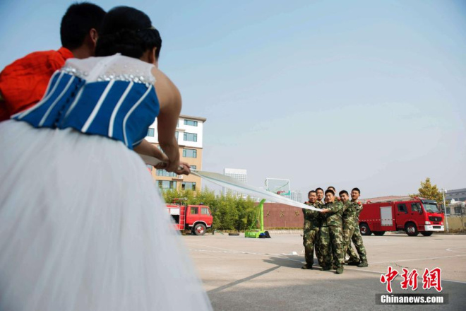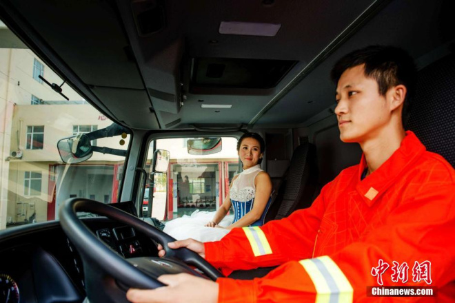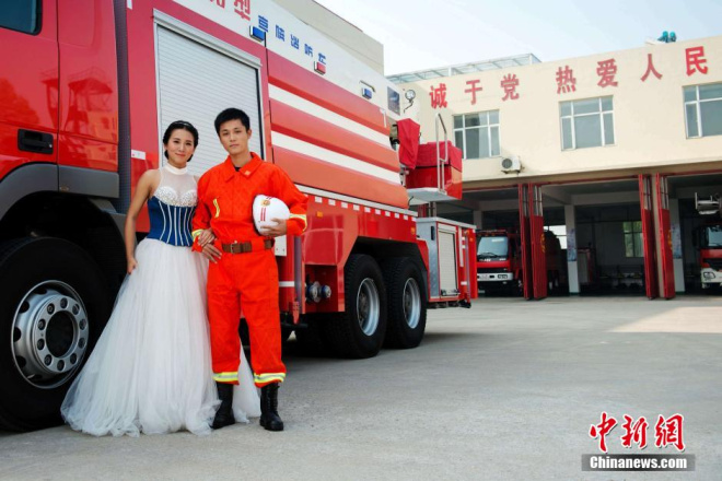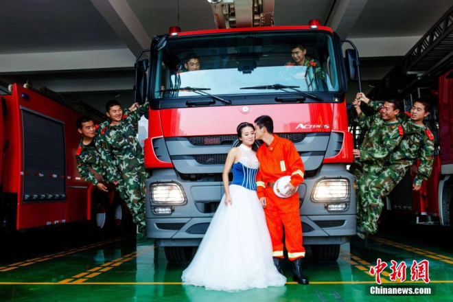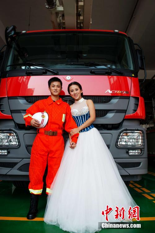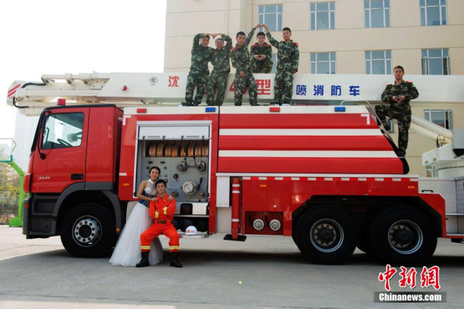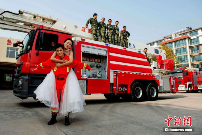 10月18日,山东省青岛市黄岛区消防队员王钧伟和新娘张颖把婚礼的外景拍摄放在了自己工作的消防队,与日夜战斗在一起的战友、消防车和水龙带一起拍摄了一组浪漫温馨的婚纱照片。中新社发金少月 摄 图片来源:CNSPHOTO
