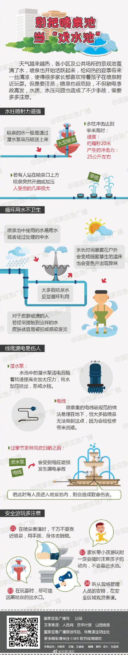 近期高温天气不断,天气越来越热,各小区及公共场所的景观池蓄满了水,喷泉也开始活跃起来。很多家长喜欢带着孩子在喷泉附近玩耍,但是要注意,喷泉也很危险,不但触电事故高发,水质、水压问题也造成了不少事故,需要多多注意!