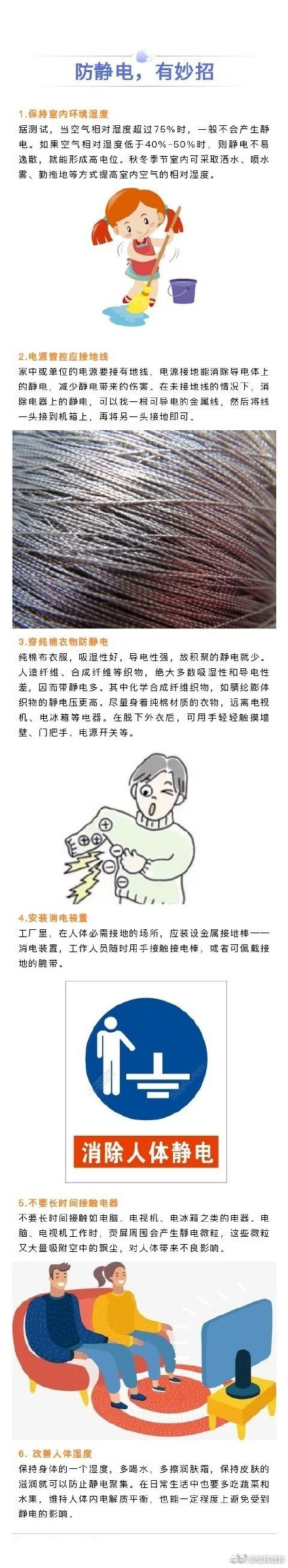 在干燥的秋冬季节,在日常生活中,人们常常会碰到这种现象:晚上脱衣服睡觉时,黑暗中常听到噼啪的声响,而且伴有蓝光;见面握手时,手指刚一接触到对方,会突然感到指尖针刺般刺痛,令人大惊失色;这就是发生在人体的静电,对人体伤害虽不大,可是时不时被电一下,却十分恼人,防静电小妙招来啦!