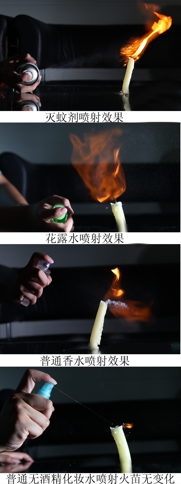 所以,我们日常喷涂的花露水时,也就相当于涂了一层酒精在皮肤表层。如果在身上喷涂了这种夹杂酒精的混合液体后,突然遇到明火时,会发生什么现象呢?