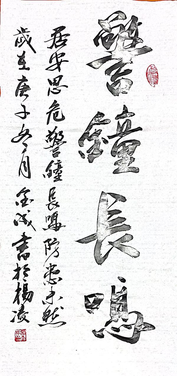 创作理念:针对大众消防安全意识薄弱、科普宣传不足等问题,作品以笔法多变、活泼传神的行书体为构思,以“警钟长鸣”为创作主题,辅以“居安思危”、“防患未然”等为解释,在表达艺术创作理念的基础上,旨在警示大众时刻关注消防科普教育,同时,提高大众的消防安全意识和安全素质。