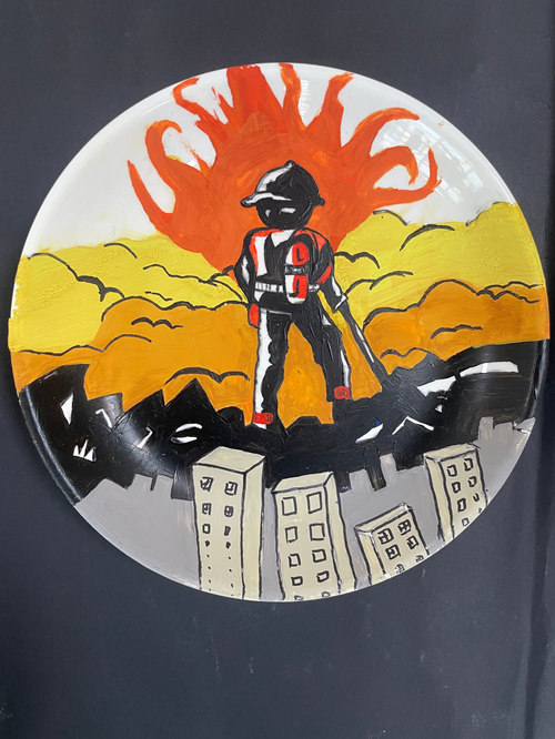 作品简介:用彩绘的形式在纯白磁盘上进行绘画,形象的表达一个平民英雄踏上征程,诠释消防救援人员在灭火救援过程中勇于抗争的勇气,他们就是自己的英雄。