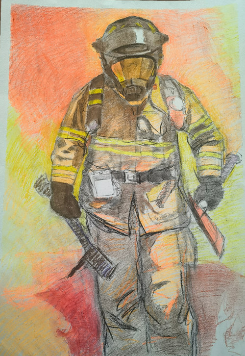 作品简介:从绘画中,体现出消防员他们坚定的身影,化身成一位“超人”与“火魔”和“死神”做斗争。