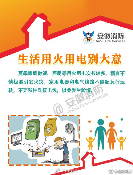 夏季家庭用火、用气、用电量大幅提高,是火灾隐患的高发期,据不完全统计,95%以上的火灾是因人为思想麻痹、消防法制观念淡薄、消防知识缺乏、用火用气用电不慎和违章操作等引起的。提醒大家注意消防安全,消除安全隐患。