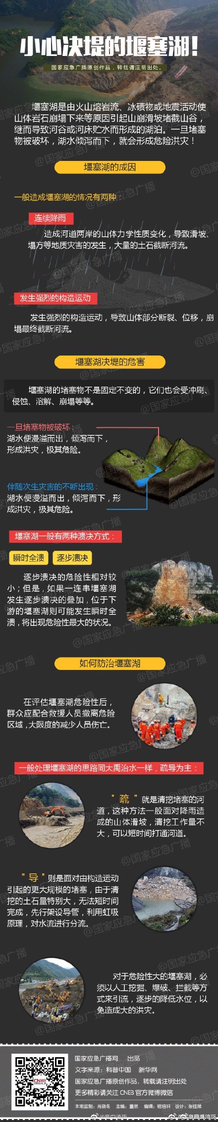 堰塞湖是由火山熔岩流、冰碛物或地震活动使山体岩石崩塌下来等原因引起山崩滑坡堵截山谷,继而导致河谷或河床贮水而形成的湖泊。一旦堵塞物被破坏,湖水倾泻而下,就会形成危险洪灾。