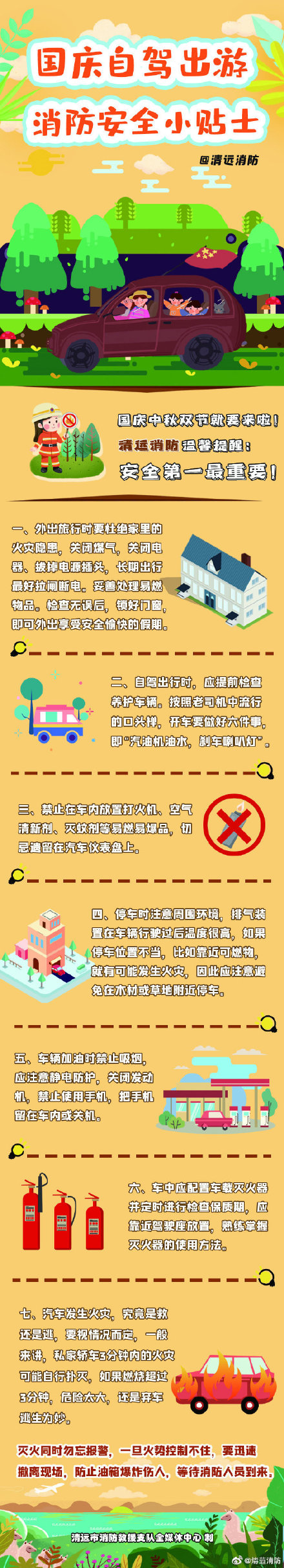 今年“中秋”“国庆”双节比肩而来,假期时间长,又逢秋高气爽。正是市民朋友出去“乘风破浪”的好时机,那你的出游计划定好了吗?不管要去哪里,请先收下,这张出游必备消防安全小贴士,储备消防知识开心过节!