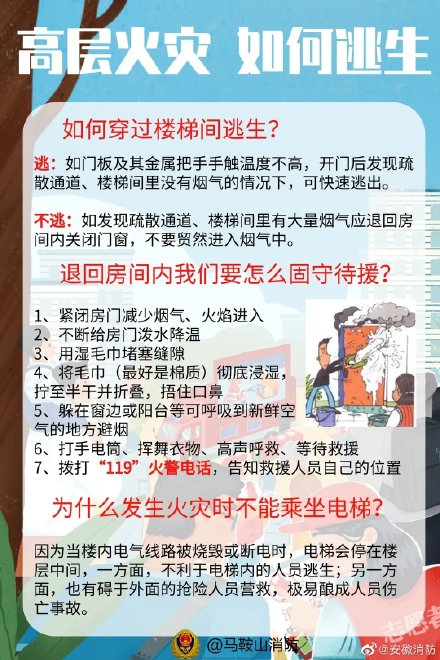 高层火灾,一定要保持冷静,切忌慌乱逃生,最重要的是,要及时拨打“119”火警电话。