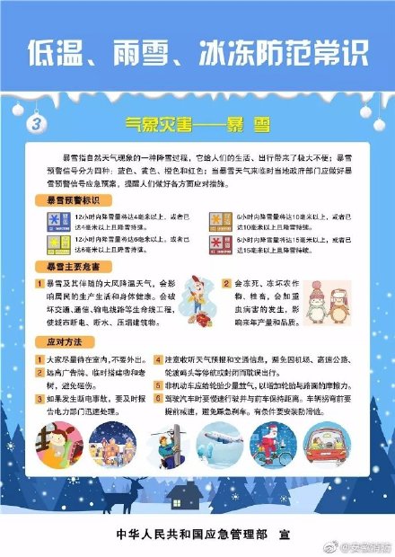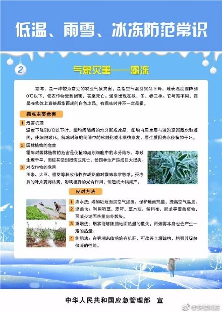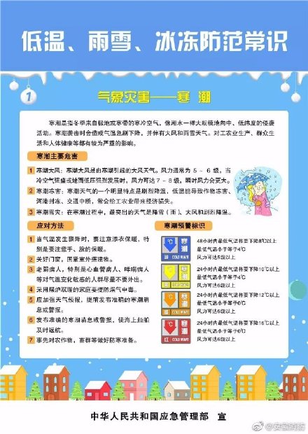 寒潮袭击时会造成气温急剧下降,并伴有大风和雨雪天气。霜冻使农作物受到损害,甚至死亡。暴雪、冻雨给人们的生活、出行带来极大不便。低温、雨雪、冰冻天气,人们一定要做好应急预案,准备应对措施。