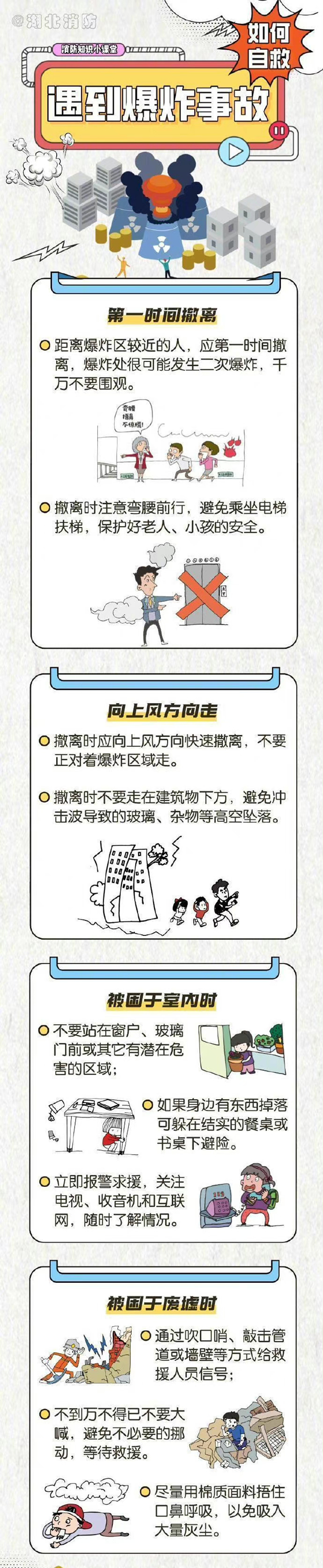 爆炸一旦发生,常常会带来巨大的伤害。如果不幸遇到爆炸,要如何自救?快来戳图了解~
