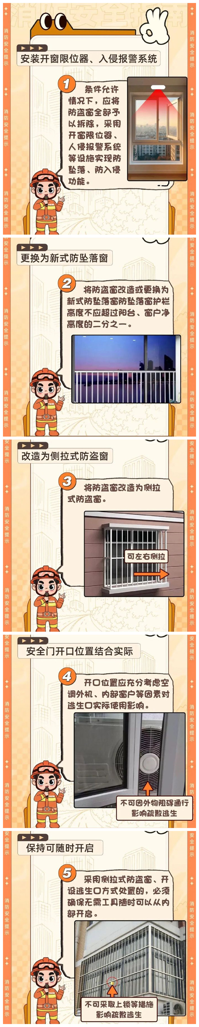 火灾发生时,如果楼道被烟火封锁,窗户往往会成为紧急逃生的重要出口。很多家庭安装了防盗窗,但全封闭的防盗不仅会阻碍被困人员逃生自救,也会妨碍消防员开展救援。为了自己和家人的安全,安装防盗窗时务必预留逃生口,为生命“网开一面”↓