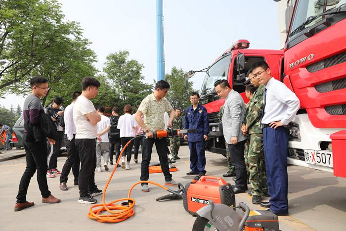 活动中,工业园中队的消防员先后介绍了中队结构、队伍建设、职能分工及消防车辆的功能用途,演示了无齿锯、液压救援设备、自救式呼吸器使用等操作,并且就爬绳、挂钩、6米拉梯等项目进行了现场演练,随后还带领大家体验了消防服的试穿,灭火器的使用。