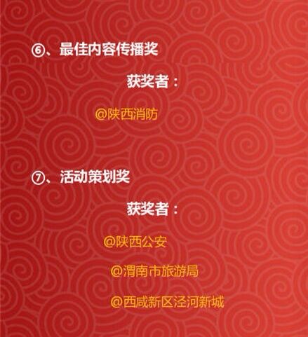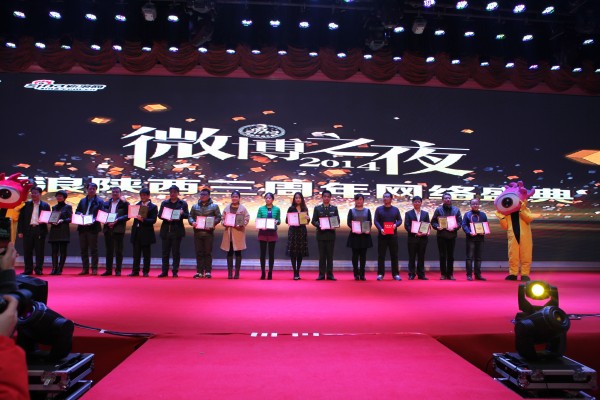 12月28日,新浪陕西三周年微博之夜暨颁奖晚会在西安大唐西市金色大厅举行。中共陕西省委网信办、陕西省电子政务办、共青团陕西省委、西安市委宣传部等单位领导出席大会。陕西各地区政府、媒体、企业、机构及微博达人代表500余人齐聚一堂,共享华彩盛会。此次活动对陕西地区2014年度热点事件、话题和人物进行全方位、多角度权威盘点。@陕西消防官方微博从全省5000余家政务微博中脱颖而出,荣获“2014年度陕西微博最佳内容传播奖”,是唯一获此殊荣的官方微博。同时,陕西消防“呐喊哥”----李治被评为“2014年度新浪微博陕西十大新闻人物”。