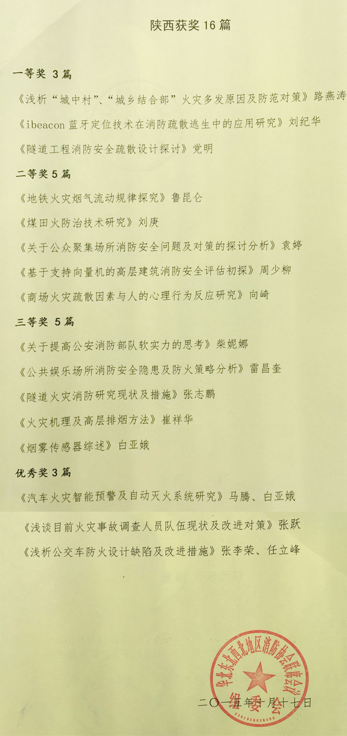 陕西消防协会十分重视这次消防学术论文征集工作。为了向“三北消防协会联席会”报送高质量的论文,早在今年三月就论文征集活动进行广泛宣传,并对报送上来的论文,从队伍管理和灭火救援、消防监督、防灭火技术、消防法治等几个方向组织相关专家进行筛选,向“三北”消防协会联席会议推荐报送了22篇文章,经过联席会组织专家评选,陕西消防协会报送的论文共有16篇获奖,其中3篇获一等奖,5篇获二等奖,5篇获三等奖,3篇获优秀奖。获奖论文编制成《华北、东北、西北地区消防协会第十一届联席会议论文集》。陕西消防协会会长贾西海代表协会出席会议,并领取了奖牌和获奖证书。