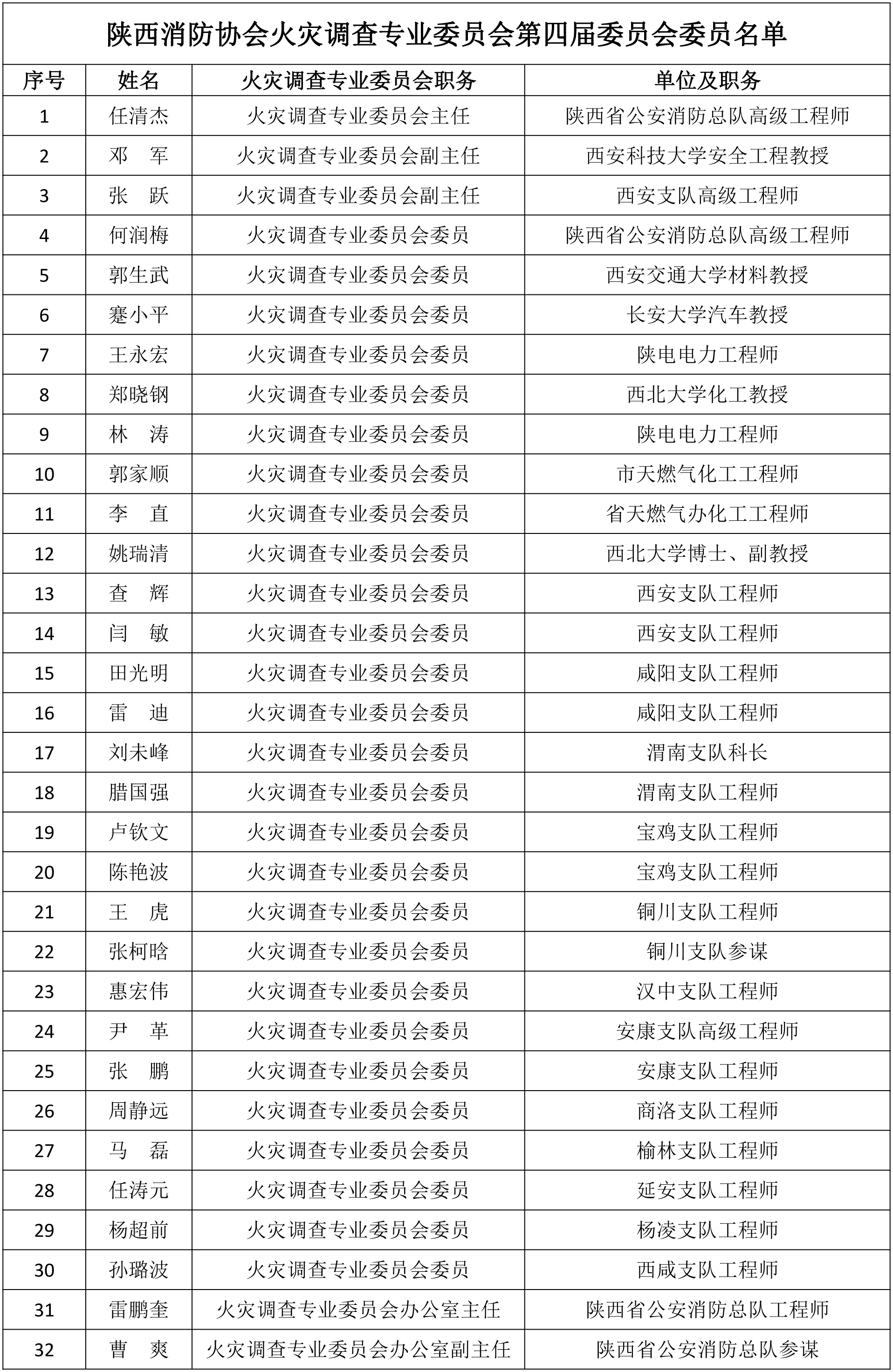任清杰被聘任为陕西省消防协会火灾调查专业委员会第四届委员会主任委员;邓军、张跃被聘任为陕西省消防协会火灾调查专业委员会第四届委员会副主任委员;何润梅、郭生武、蹇小平等27人被聘任为第四届委员会委员。(详细名单附后)