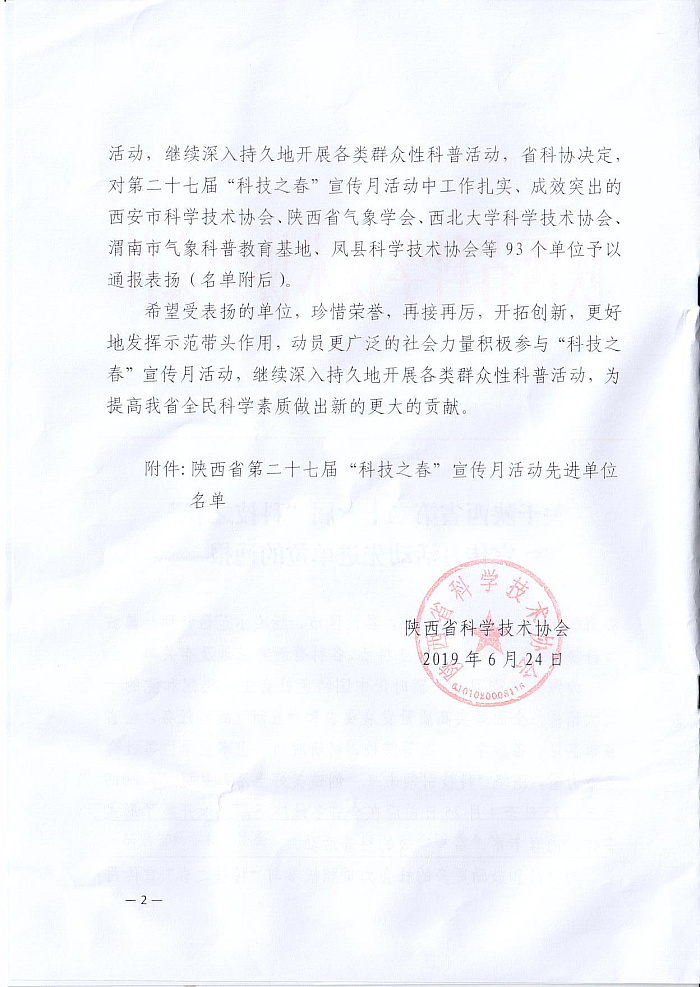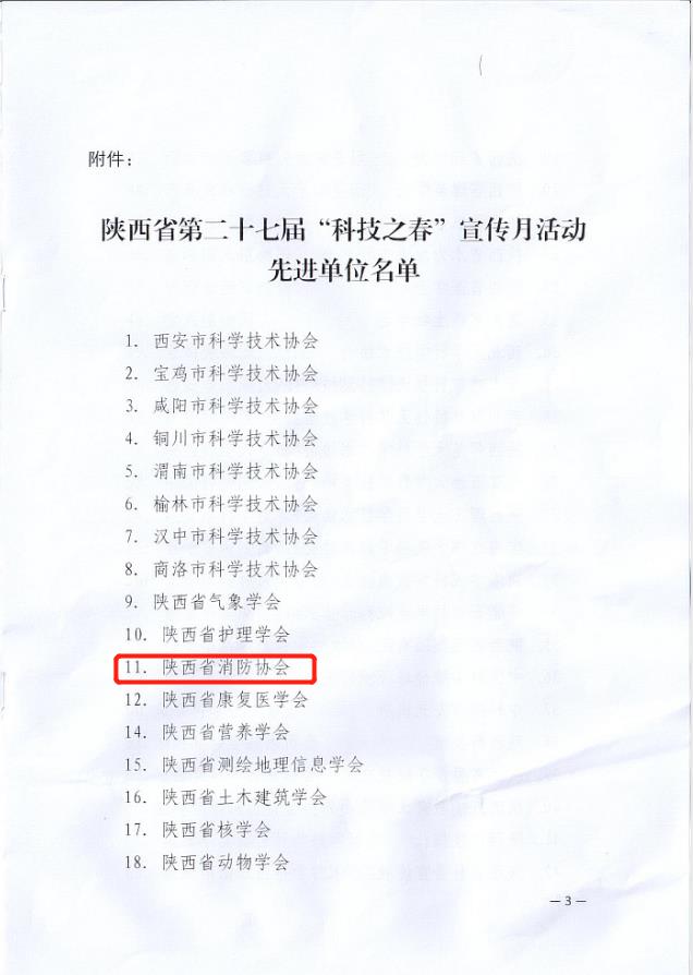 近日,陕西省科学技术协会发布了《关于陕西省第二十七届“科技之春”宣传月活动先进单位的通报》,陕西省消防协会荣获“先进单位”。