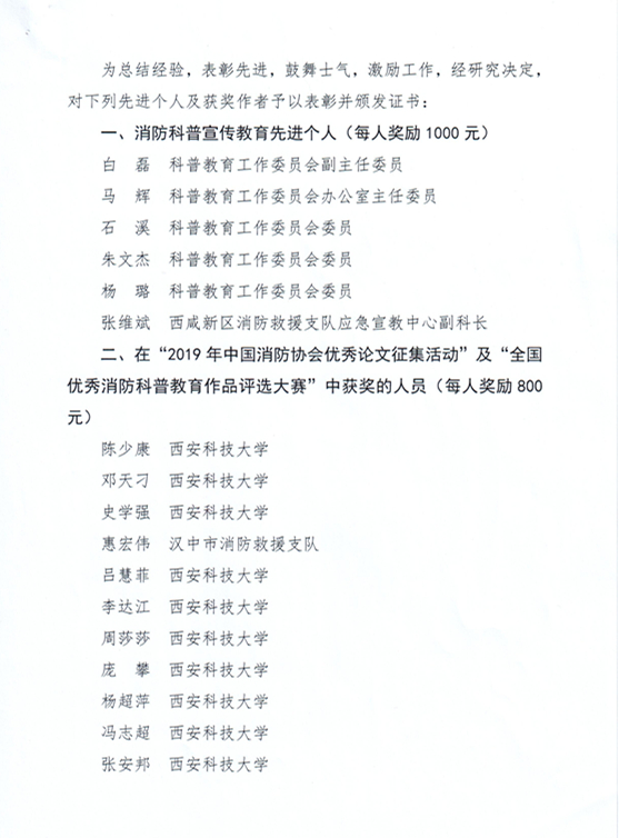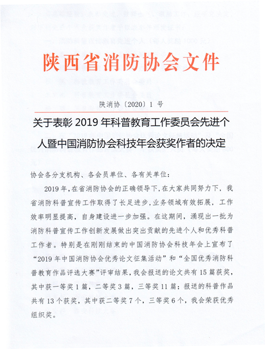 关于表彰2019年科普教育工作委员会先进个人暨中国消防协会科技年会获奖作者的决定