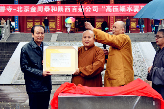 本次活动由大兴善寺监寺法师罗福主持。陕西百赫实业有限公司总经理李玉宏和北京金同泰科技有限公司董事长郭文琪在捐赠仪式上作了精彩的讲话,罗福法师代表寺院方分别为两家企业颁发了《功德证书》。