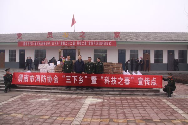 3月6日,渭南市2014年“科技、文化、卫生三下乡”暨“科技之春”宣传活动在渭南市合阳县王村镇北王村举行。陕西省消防协会副理事长贾西海,省消防协会秘书长卞建峰及渭南市科协、消防协会等相关领导出席了本次活动。活动期间,渭南市消防协会向合阳县北王村捐赠了价值6万余元的灭火器、30盘消防水带、5000册消防安全知识书籍,并向现场群众发放了2000余副消防卡通扑克、2000余个消防手提袋。