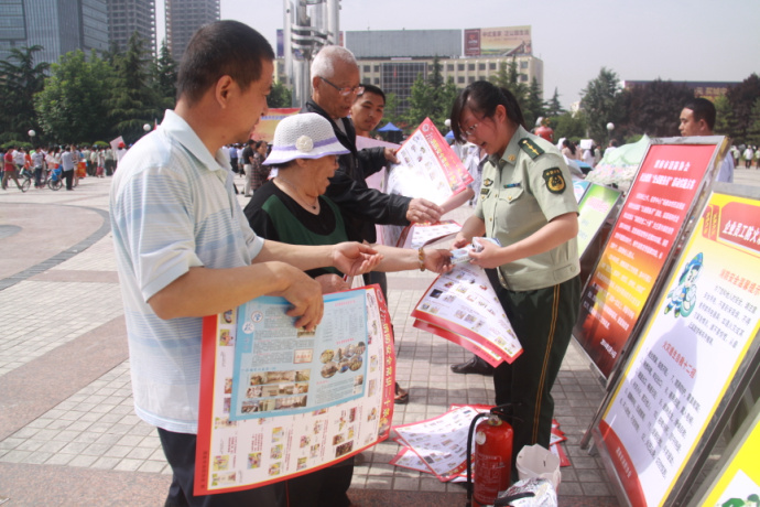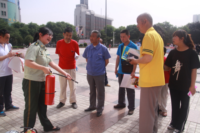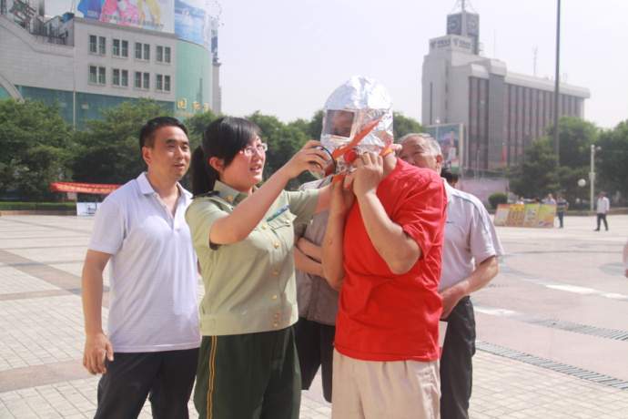 活动现场,渭南市消防协会联合渭南消防支队的宣传人员,本着提高全民消防安全意识的目标,向现场群众发放精心准备的《消防常识二十条》、《消防法》、火场逃生知识、消防常识等宣传材料,利用展板、宣传资料上的火灾案例、火灾逃生自救、扑救初起火灾、火灾预防常识的图片和资料以图文并茂、通俗易懂的方式为群众讲解消防安全常识和防火、灭火的消防安全知识。同时,就群众提出的如何拨打报警电话、如何使用灭火器、如何排查火灾隐患、如何自救逃生等问题进行了详细的解答,还现场让群众体验了一下如何正确利用防毒面具从火场逃生,吸引了众多群众驻足观看。受到了广大人民群众的好评。