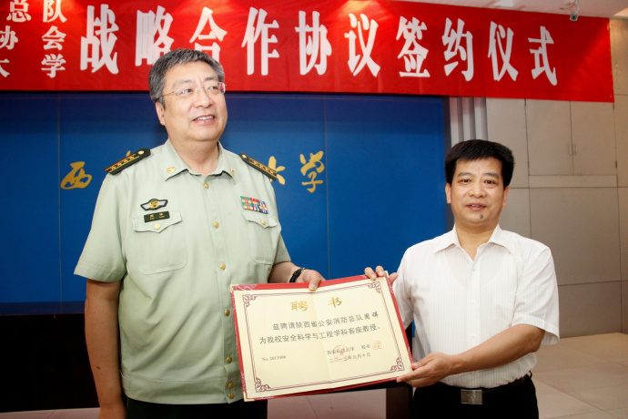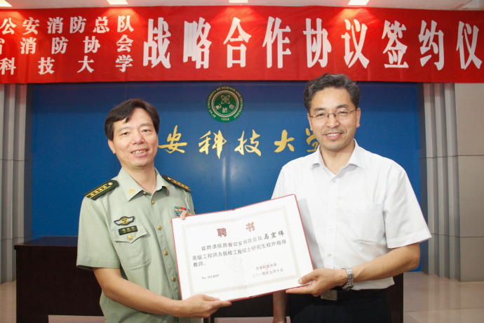 仪式上,周详总队长、杨更社校长、卞建峰秘书长共同在合作协议上签字;杨更社校长向周详总队长颁发客座教授聘书;李树刚副校长向张明部长、卞建峰秘书长等颁发校外指导教师聘书。