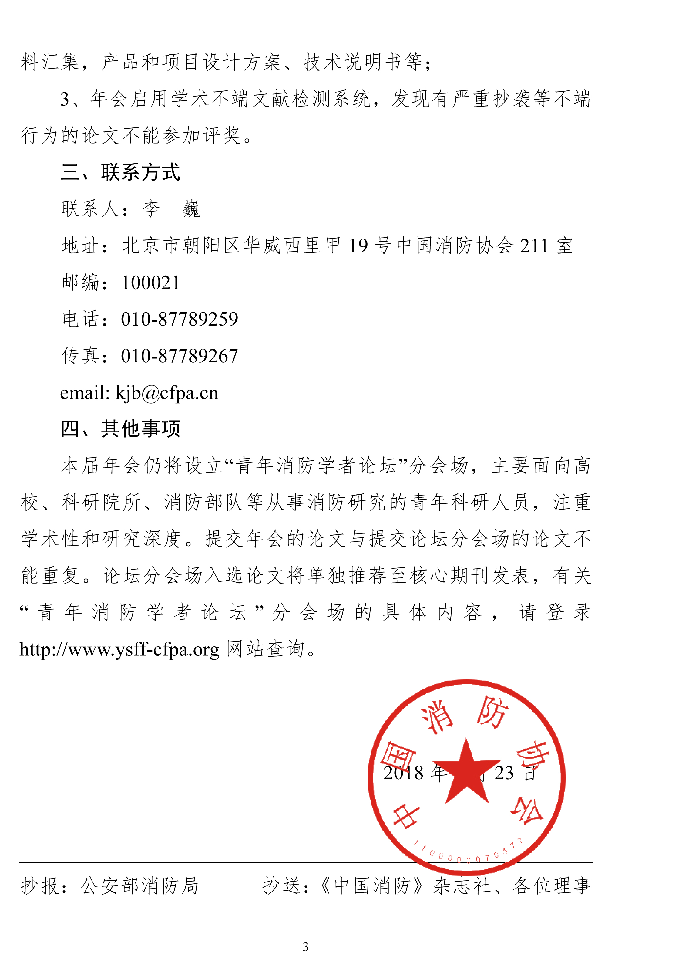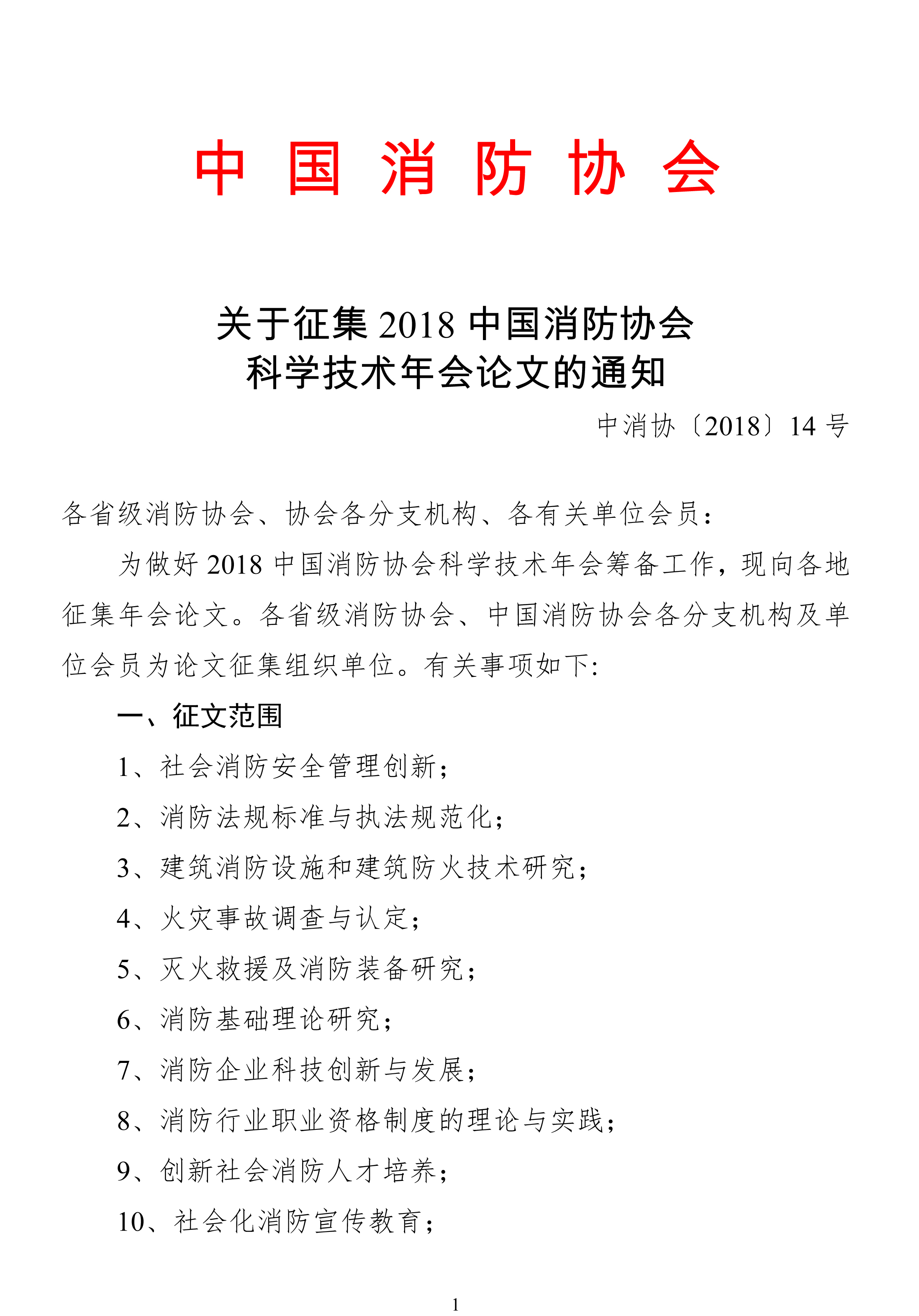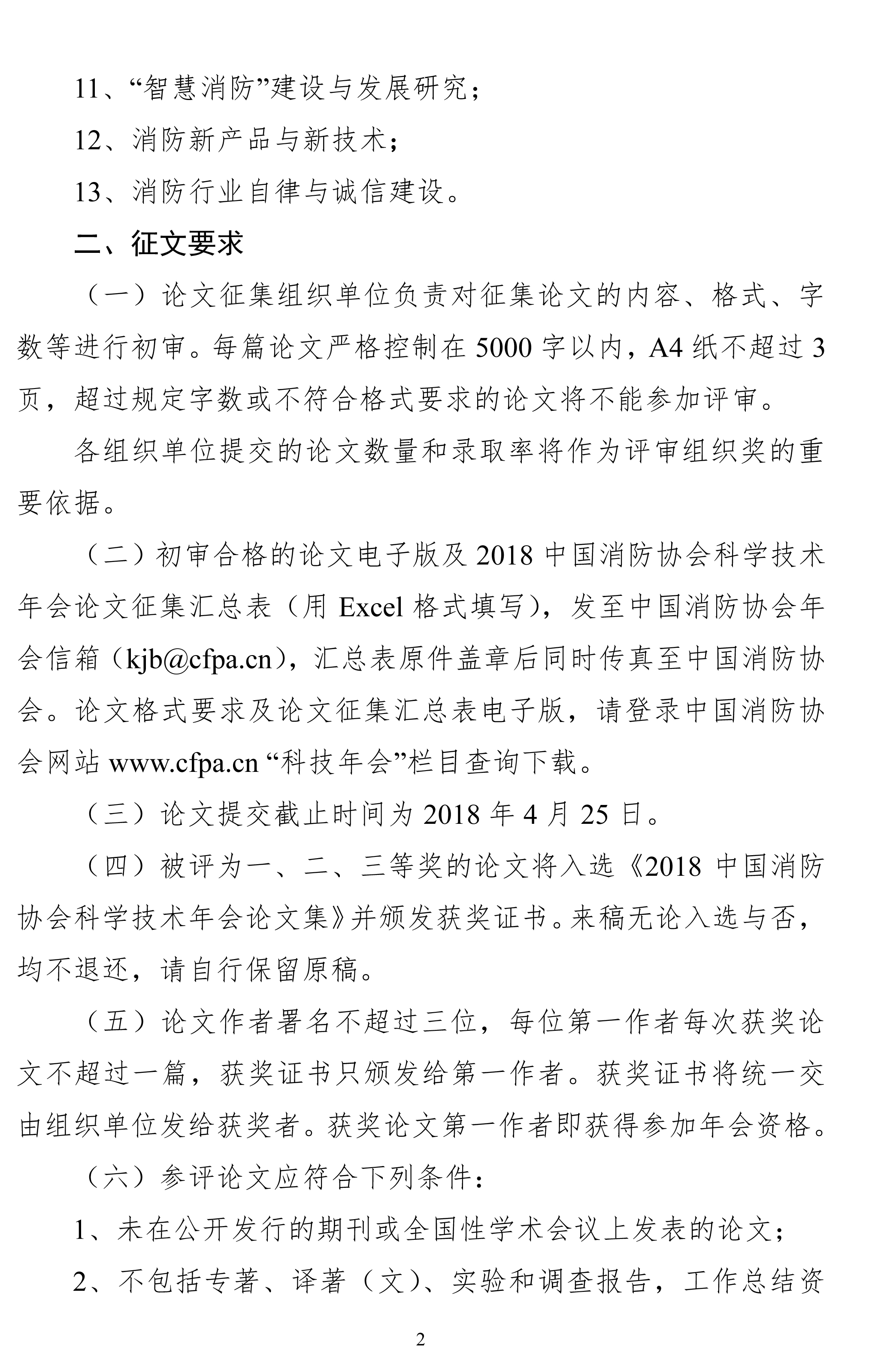 现将中国消防协会《关于征集2018中国消防协会科学技术年会论文的通知》转发你们,望各单位根据要求,结合工作实际,于2018年4月20日前将本单位的论文电子版及“2018中国消防协会科学技术年会论文征集汇总表”(用Excel格式填写),发送至陕西省消防协会科普教育工作委员会邮箱,并电话告知。