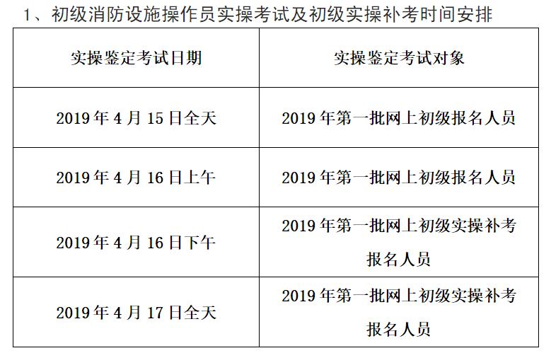 2019415(星期一)至417日(星期三)组织初级消防设施操作员实操鉴定考试和实操补考;