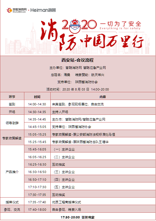 由慧聪消防网主办深圳市海曼科技股份有限公司冠名的“2020消防中国万里行——西安站”活动将于8月3日在西安举办。届时,慧聪消防网将邀请一线消防企业、工程商、经销代理商、设计院及专家线下聚会,共同探讨消防行业热点,寻找区域市场发展新机遇。