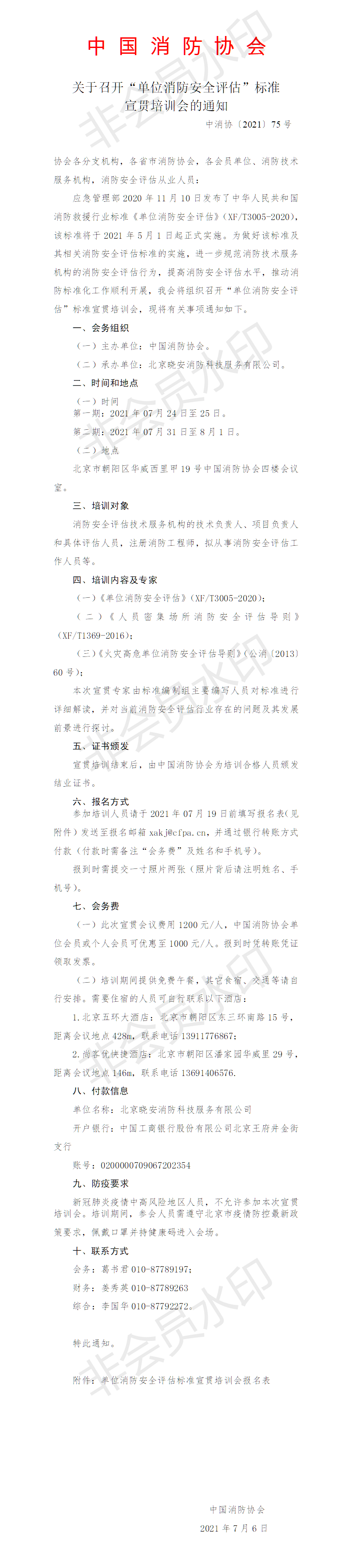 现将中国消防协会《关于召开“单位消防安全评估”标准 宣贯培训会的通知》转发你们,望各单位结合各自情况自愿参加。