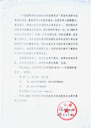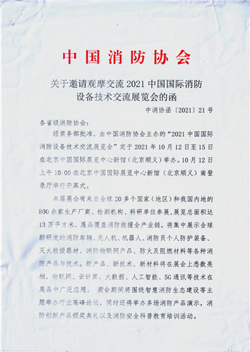 附件:1.《关于邀请观摩交流2021中国国际消防设备技术交流展览会的函》