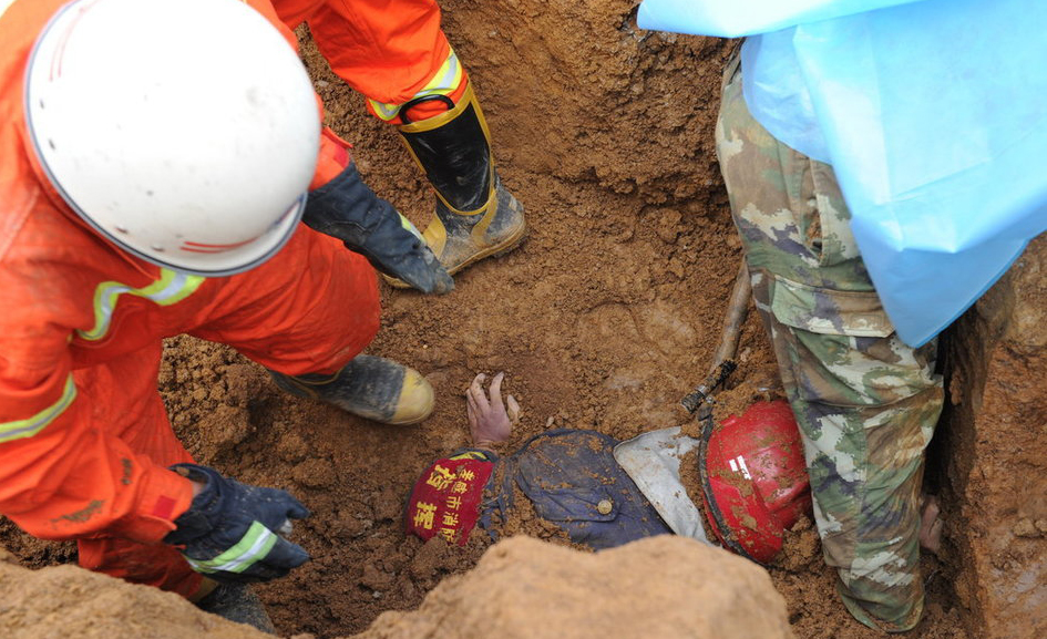 2014年5月26日,湖北安陆一工地发生塌方,3名消防员救人牺牲,中队长卢亮至死都保持着救人的姿势。图片来自网络