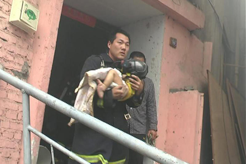 2014年3月30日下午16时43分许,江苏省徐州一居民楼着火,消防官兵及时将空气呼吸器面罩拿了下来并放到婴儿的口鼻处,为婴儿送上新鲜的空气。图片来自网络