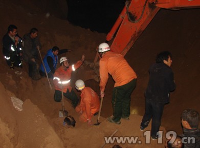 11月28日18时49分,陕西渭南市站北路消防中队接到群众报警称,市临渭区保丰4组钢材厂内的一施工工地突然塌方,其中有4名工人被土方埋压生死未卜,请求紧急救援。接到报警后,中队迅速出动两辆消防车和11名救援官兵迅速赶赴事发现场,50分钟成功将被困工人救出。