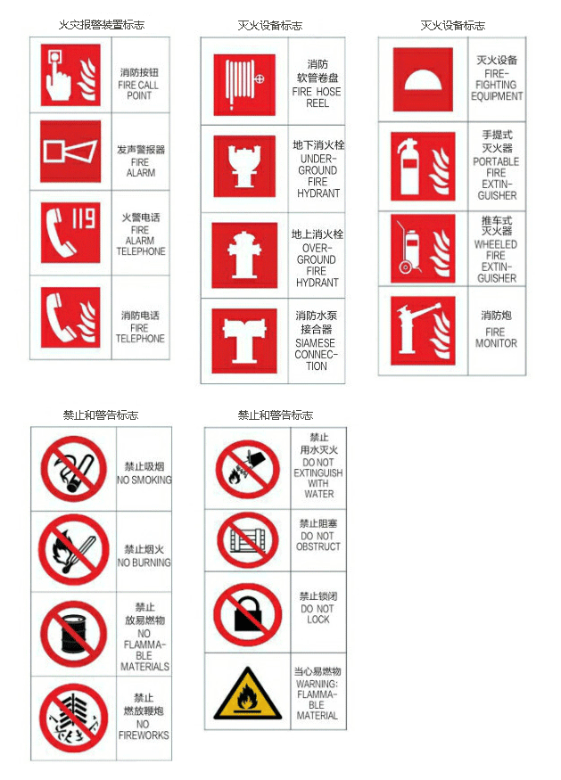 今年8月1日实施的新标准,将消防安全标志分为火灾警报装置标志、紧急疏散逃生标志、灭火设备标志、禁止和警告标志、方向辅助标志、文字辅助标志等6类,共有25个常见标志和2个方向辅助标志。