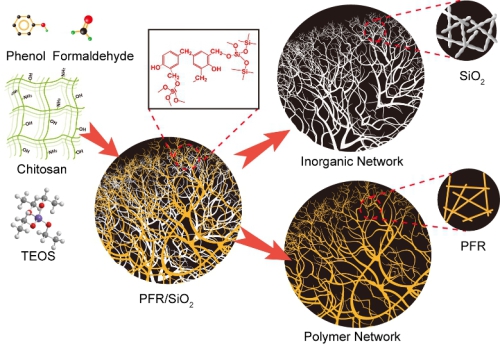 近日,中国科学技术大学教授俞书宏课题组以壳聚糖作为三维软模板,发展了一种酚醛树脂(PFR)与SiO2共聚和纳米尺度相分离的合成新策略,成功研制出具有双网络结构的PFR/SiO2复合气凝胶材料。