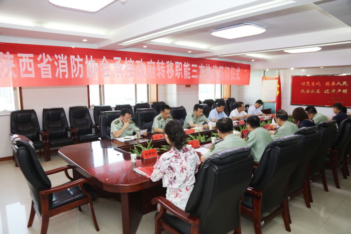 9月3日上午,陕西省消防协会承接政府转移职能三方协议签订仪式在省消防总队成功举行。省科协党组成员、副主席党广录,省消防总队党委书记、政委张飞军,省消防协会会长贾西海出席仪式并讲话。签订仪式由省消防总队总工程师张明主持。省科协学会学术部副部长田世坡,省消防总队防火监督部部长吴钢,省消防协会秘书长卞建峰及三方其他相关人员20余人参加了仪式。