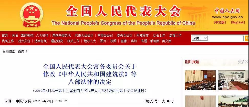 4月23日下午,第十三届全国人民代表大会常务委员会第十次会议,表决通过《中华人民共和国建筑法》、《中华人民共和国消防法》等八部法律的修改。