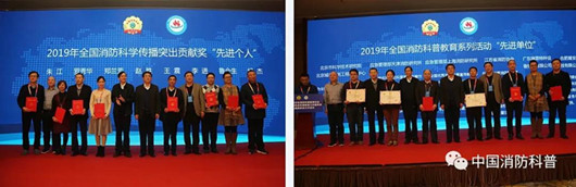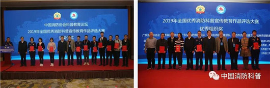 《消防安全我知道—家庭消防安全亲子读本》等11个作品获得2019年全国优秀消防科普宣传教育作品评选大赛一等奖,《森林消防常识漫画》等41个作品获得二等奖,《小学生消防安全知识读本1-3年级》等66个作品获得三等奖;广东省消防协会、陕西省消防协会、河南省消防救援总队、广东省消防救援总队、合肥市消防救援支队、杭州市消防救援支队等6家单位获得2019年全国优秀消防科普宣传教育作品评选大赛优秀组织单位奖;李进、罗秀华、纪杰、鲁会生、赵胜、郑兰芳、朱江、王震等8人获得2019年全国消防科学传播突出贡献奖先进个人;应急管理部上海消防研究所、应急管理部天津消防研究所、江苏省消防协会、北京市科学技术研究院北京城市系统工程研究中心、广东瑞霖特种设备制造有限公司、合肥耀安科技有限公司等6家单位获得2019年全国消防科普教育系列活动先进单位。