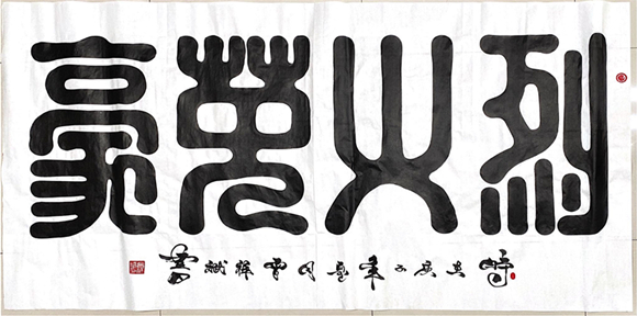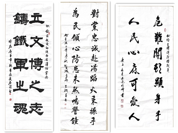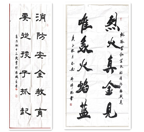 省消防协会会长贾西海、秘书长卞建峰与书法家们进行了亲切的会谈,贾西海会长介绍了协会在消防科普宣传方面的主要工作和成绩。创作期间,王刚副主席亲自编撰并提笔写下“对党忠诚赴汤蹈火秉操守,为民倾心防范未然鸣警钟”这副对联,字体行云流水、矫若惊龙,赢得在场人员连连称赞;曾祥斌院长,凝神构思、笔走龙蛇在纸上写下“烈火英豪”四个大字,字体气势磅礴、笔酣墨饱。石溪院长13岁的孙女专程前来书写了“消防安全教育要从孩子抓起”,各位书法家们即兴创作、挥毫泼墨、各显神通,一幅幅佳作渐浮纸面,现场顿时被浓浓的文化气息包围,不时响起阵阵掌声。“烈火真金见,唯我火焰蓝”、“牢记职责使命,传承优良作风”、“不忘初心”、“危难关头显身手,人民心底可爱人”等作品一气呵成,犹如腾龙走蛇,气象万千。