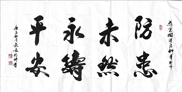 为进一步搞好消防科普宣传工作,弘扬消防精神,创作出更多消防科普宣传作品,让全社会进一步了解消防、关心消防,8月21日省书法协会副主席王刚、中国国画研究院陕西分院院长曾祥斌、西安皇都书画艺术研究院院长石溪、陕西神州书画研究院常务副院长董瑞琦和陕西秦源书画院副院长张明琦一行五人莅临省消防协会为“2020年全国优秀消防科普宣传教育作品大赛”创作消防科普书法作品。
