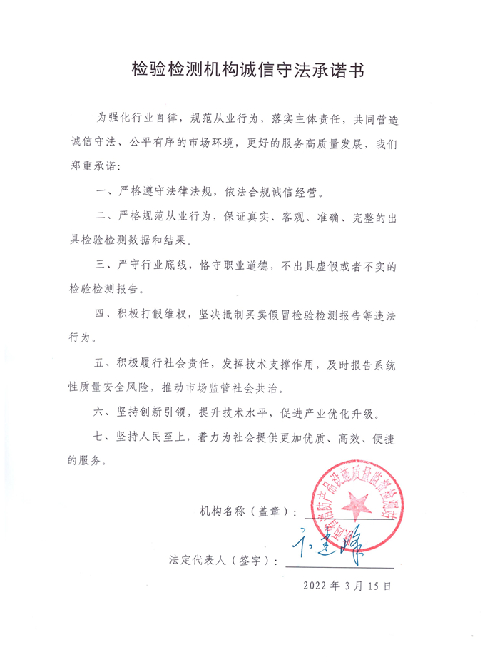 在第40个“3.15”国际消费者权益日来临之际,为提高我站技术服务能力,进一步做好检验检测相关工作,强化行业自律,规范从业行为,落实主体责任,共同营造诚信守法、公平有序的市场环境,更好的服务高质量发展,我们做出诚信守法的郑重承诺: