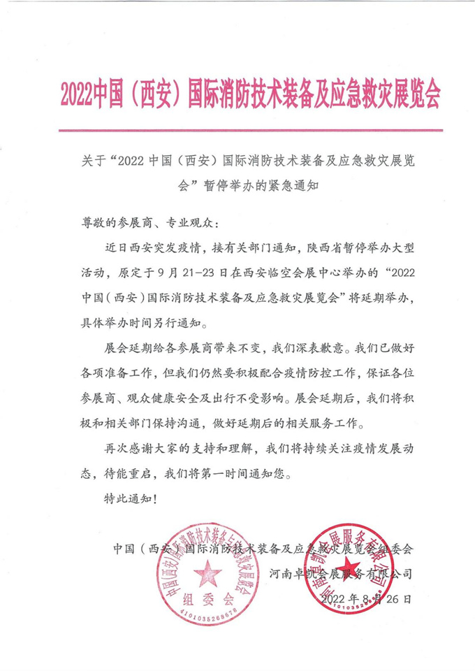 转发“关于‘2022中国(西安)国际消防技术装备及应急救灾展览会’暂停举办的紧急通知”的通知